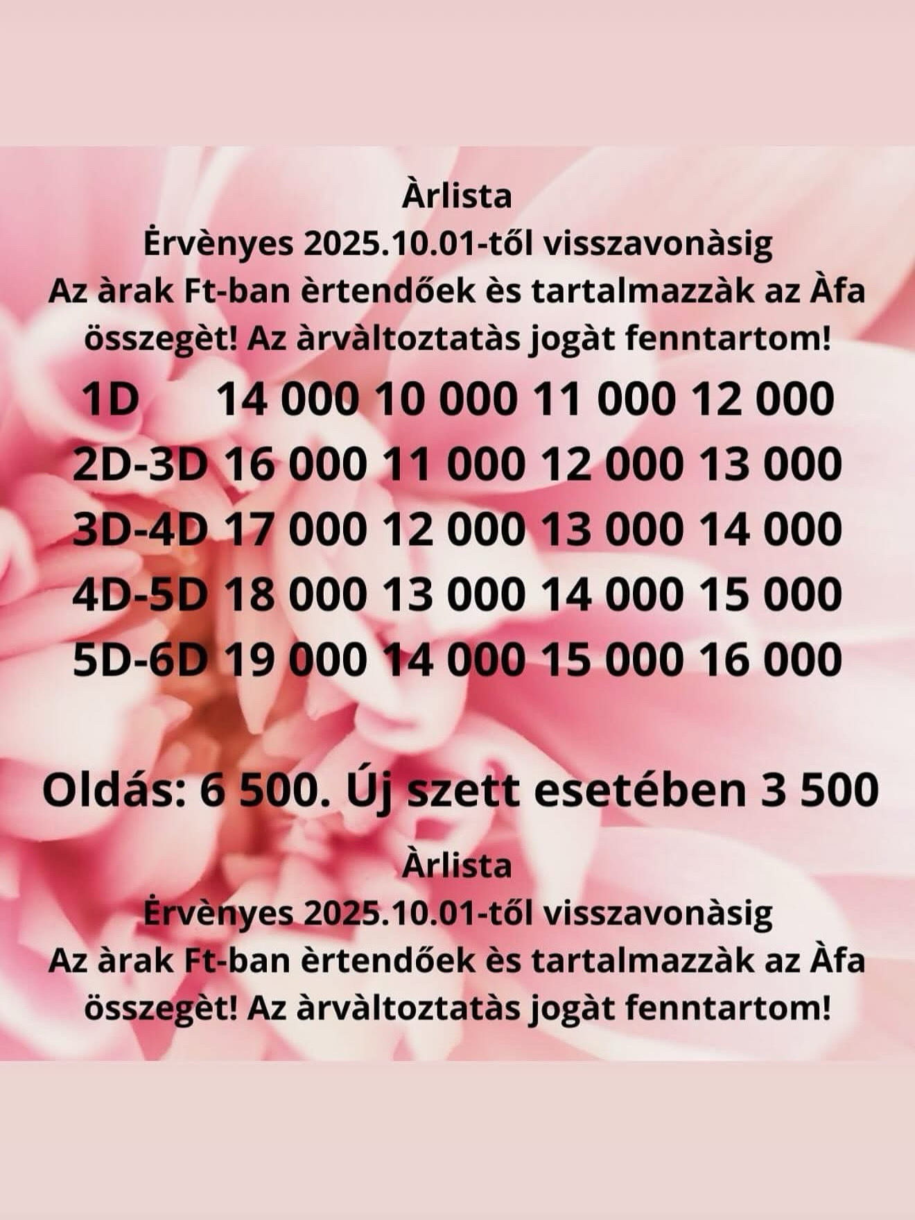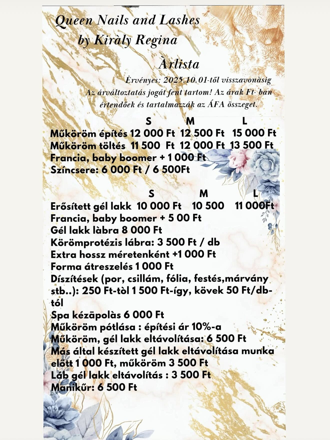 Műköröm és műszempilla árlista, érvényes 2024.10.01-től! Az árváltoztatás jogát fent tartom! Az árak Ft-ban értendőek és tartalmazzák az ÁFA összegét!