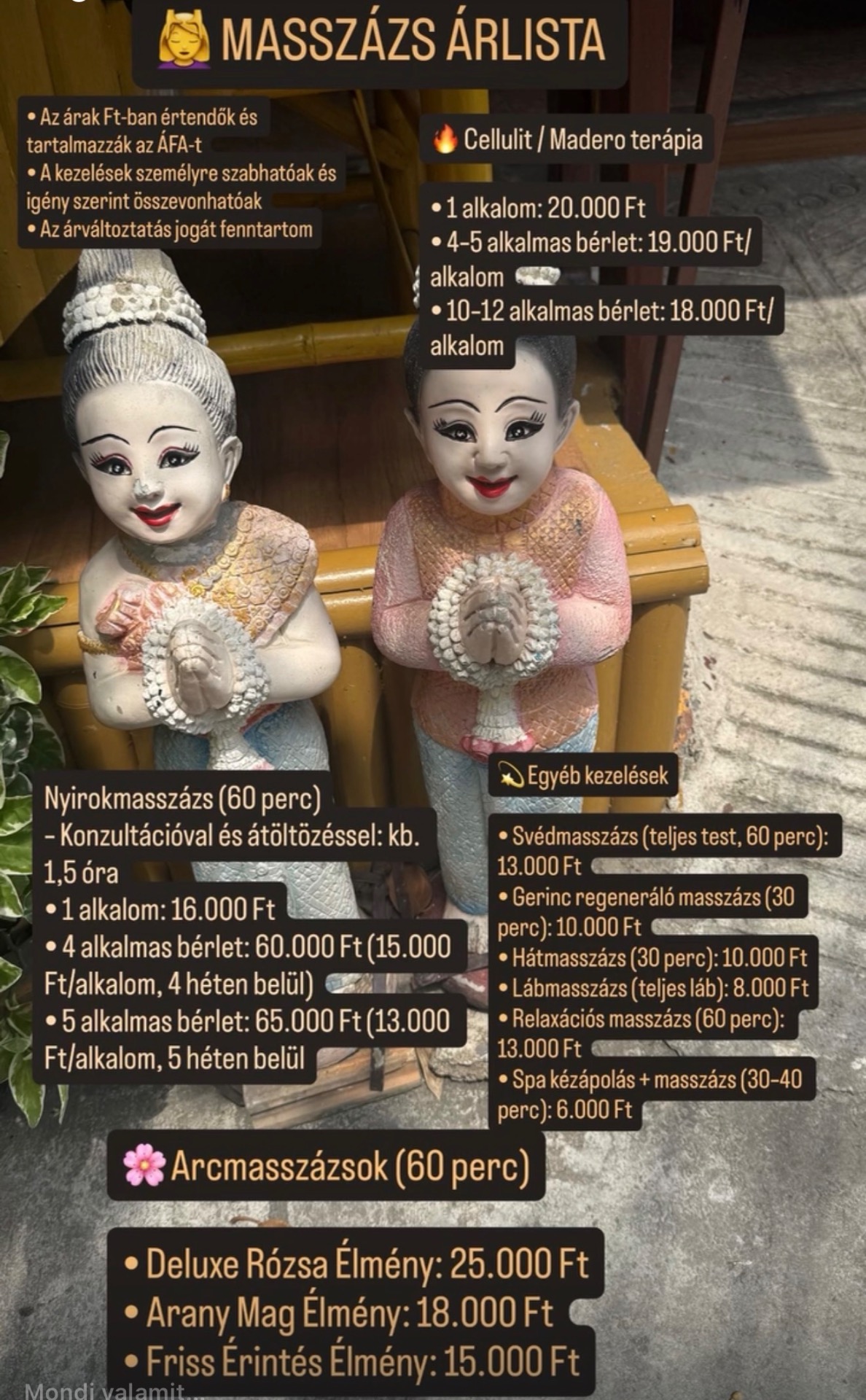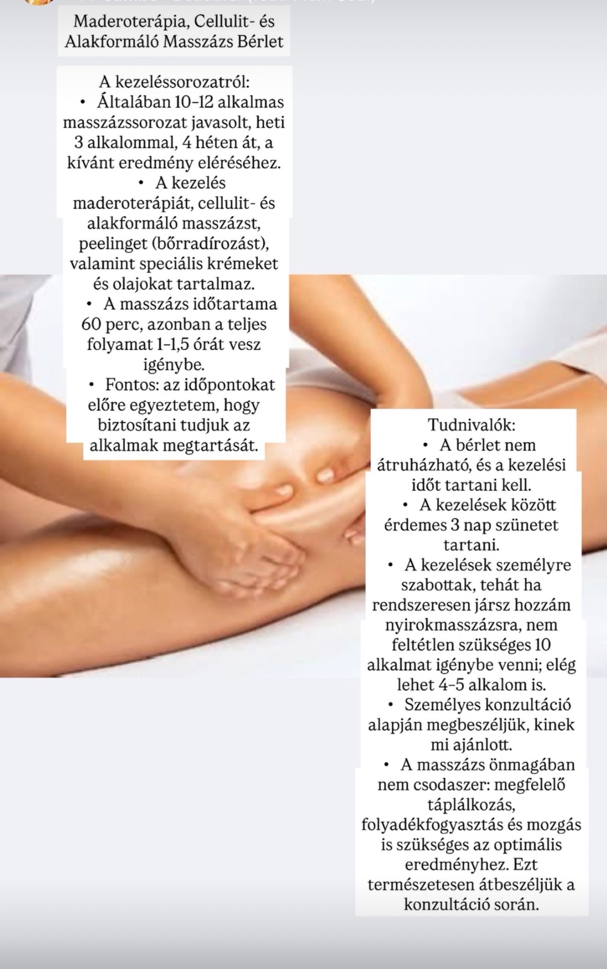 Masszázs (cellulit és maderoteràpia, nyirokmasszázs, gerincregeneráló masszázs, svédmasszázs, aromamasszázs, làbmàsszázs, hátmasszázs)