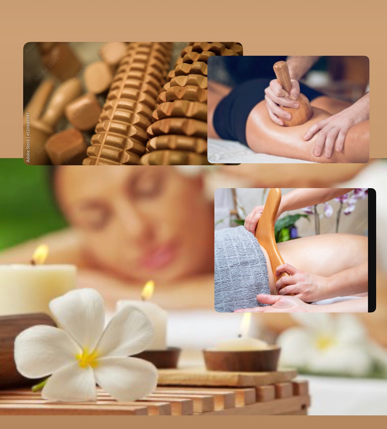 A masszázs során többféle fa eszközt is használok a hatékonyság növelésére, és a kezelés kiterjed az arcra, lábra, hasra, hátra és a karokra is.